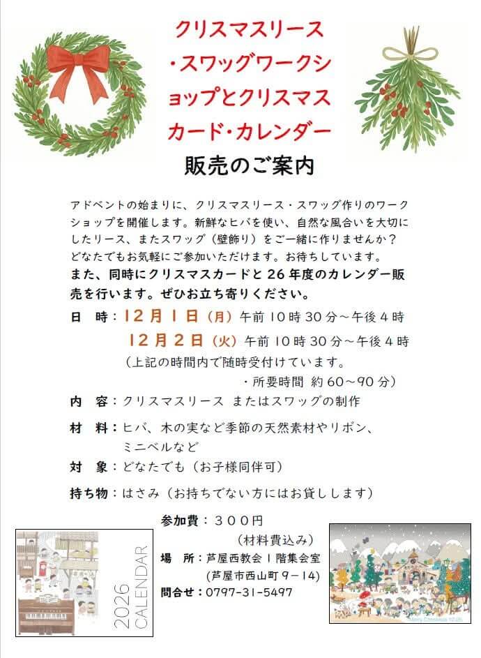 ☆教会の玄関前で、手作りのクリスマス・カードと2026年度のカレンダーを販売します。